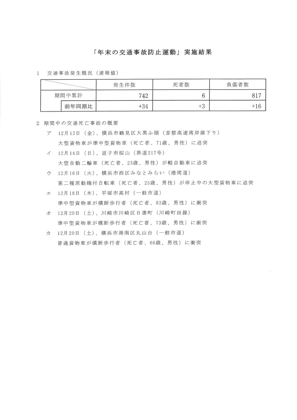 本運動期間中の交通事故の発生状況につきましては、昨年同時期と比べ発生件数、負傷者数及び死者数のいずれも前年の同じ時期と比べて増加し、6名の尊い命が失われる結果となりました。