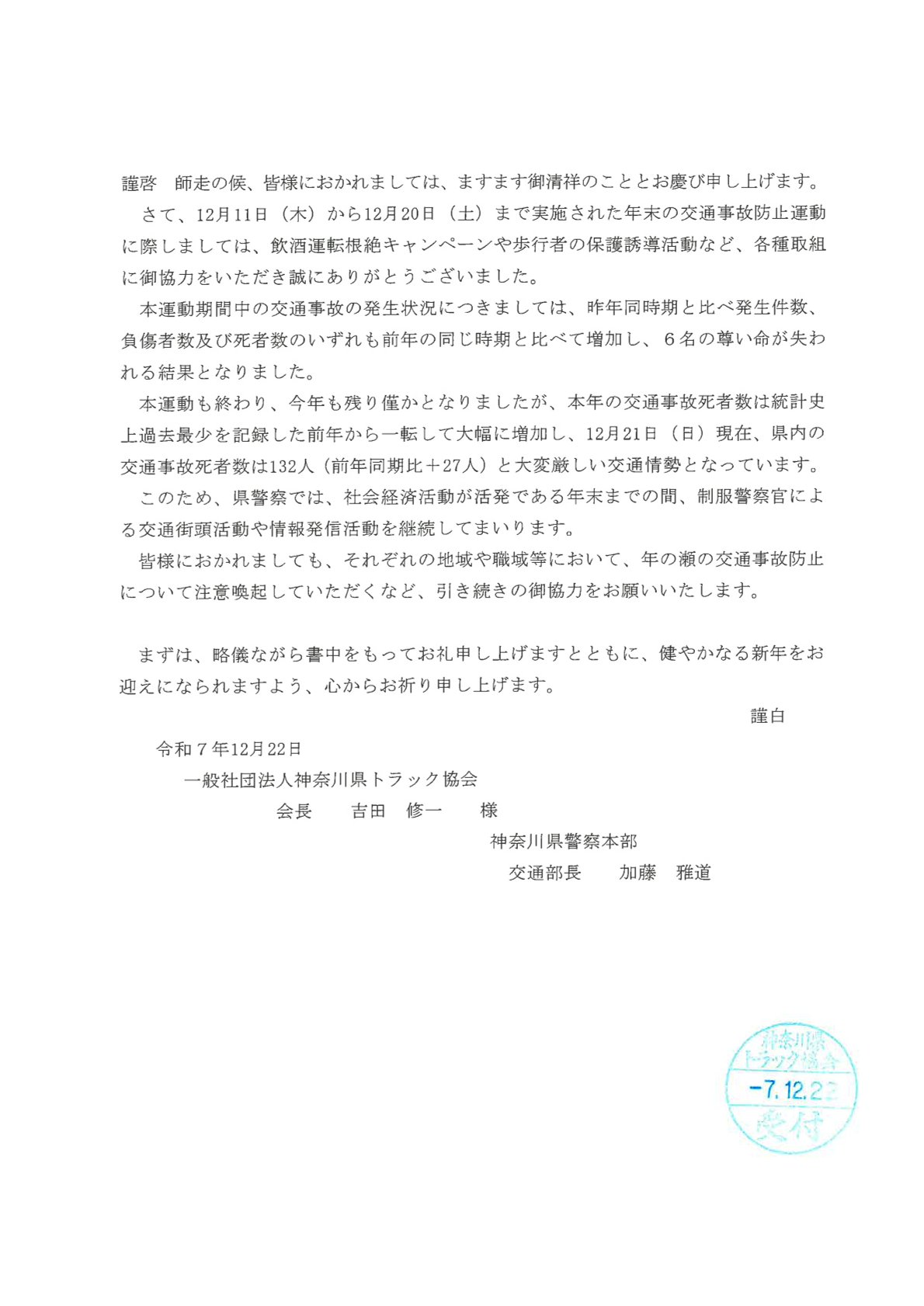 会員の皆様におかれましては、年末の交通事故防止運動期間中多大なるご協力を賜りました事を厚く御礼申し上げます。表題については、神奈川県警察本部より年末の交通事故防止運動期間中の諸活動に対しお礼の文章が届きました。