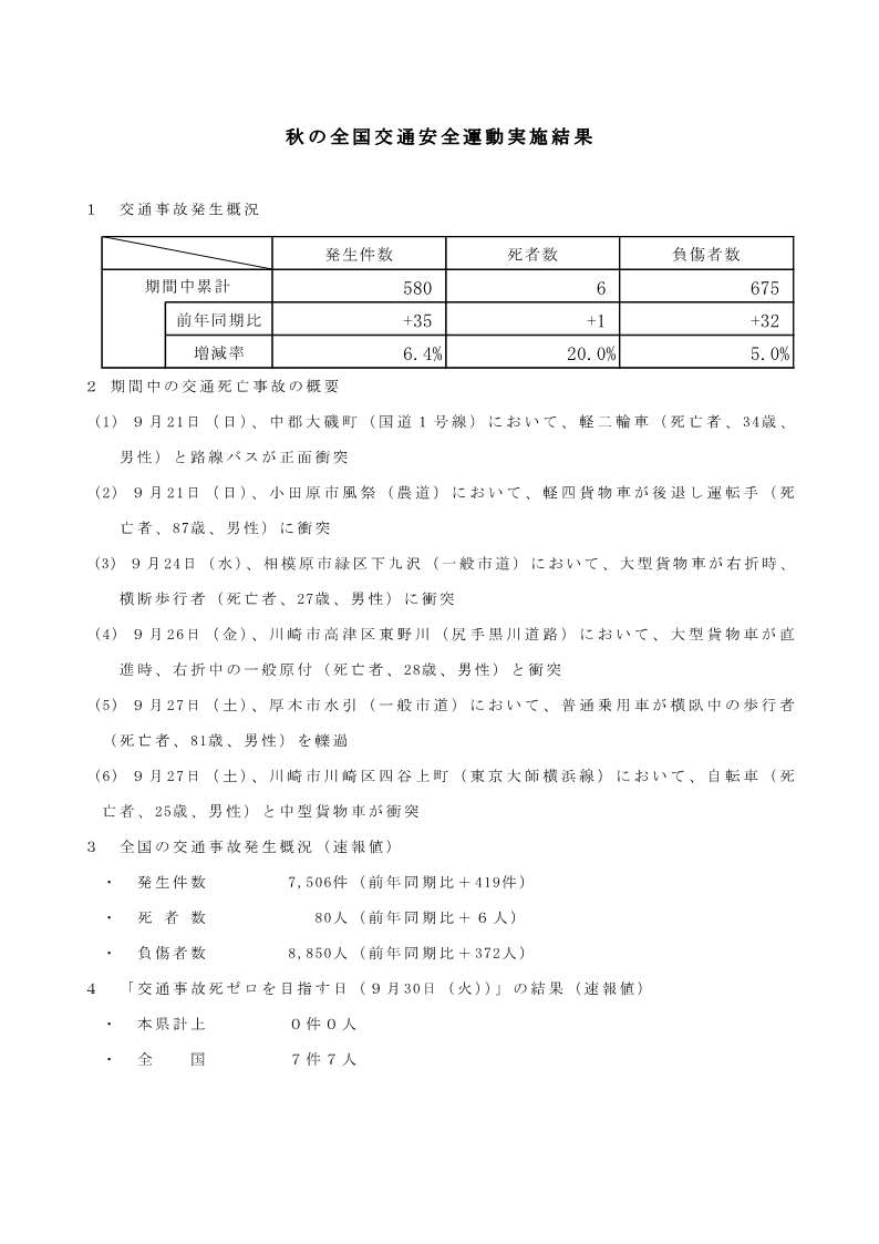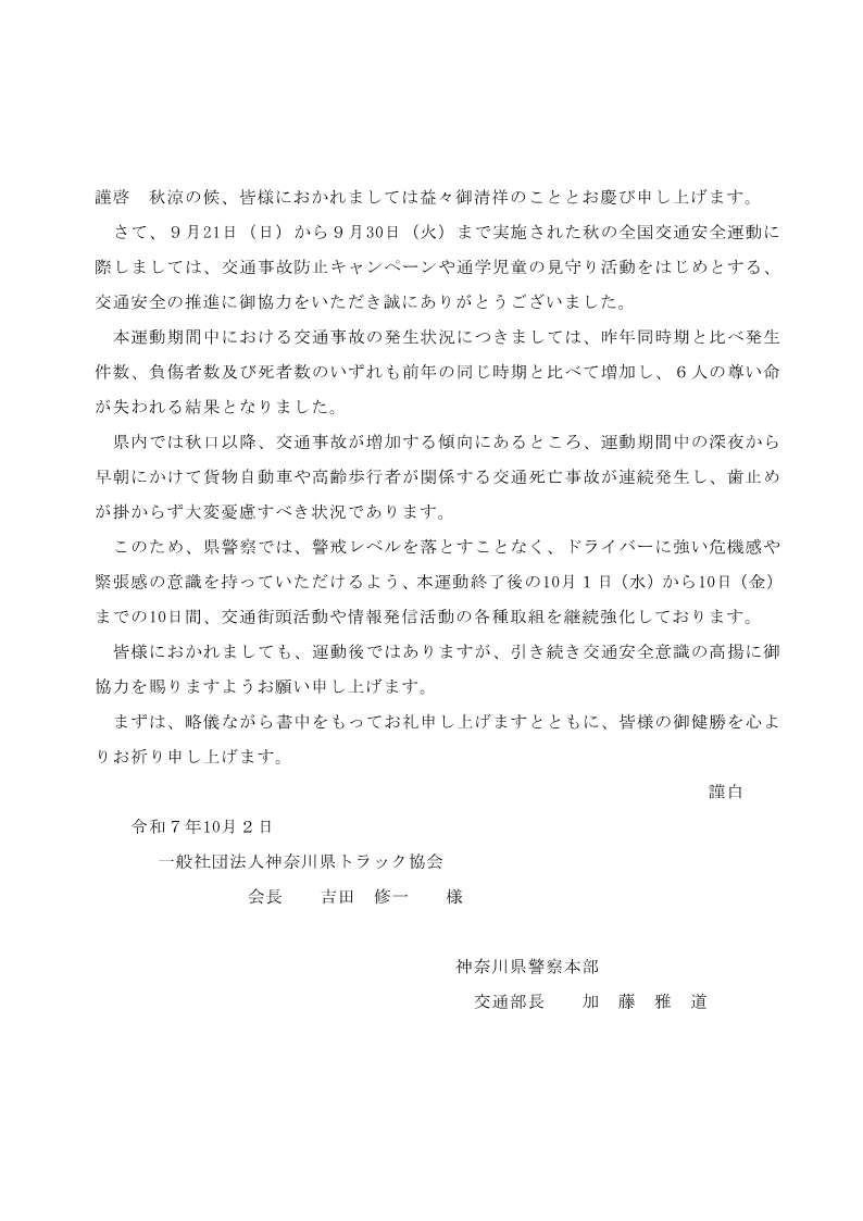 会員の皆様におかれましては、秋の全国交通安全運動期間中多大なるご協力を賜りましたことを厚く御礼申し上げます。この度、神奈川県警察本部より、秋の全国交通安全運動期間中の諸活動に対し、お礼の文章が届きましたのでご報告させていただきます。